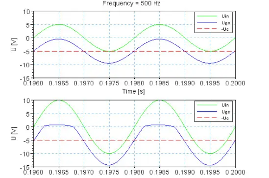 The second reason for clipping is caused by grid current. High peaks of the positive half-wave of the input signal make the grid voltage positive compared to the cathode voltage. In this case electrons are attracted by the grid. The grid current causes a voltage drop at the internal resistance of the previous stage, which limits the input signal. The following figure shows the effect. The grid voltage is obtained by shifting down the input signal (Uin) by the cathode voltage (Uc). In the upper picture the maximum grid voltage (Ugc) is ~ 0 V compared to the cathode. Hence, there is no grid current. In the lower picture the input signal has an amplitude of 10 V. At the positive peaks of the input signal the grid voltage rises above 0 V (compared to the cathode). The grid current begins to flow and clips the grid voltage.