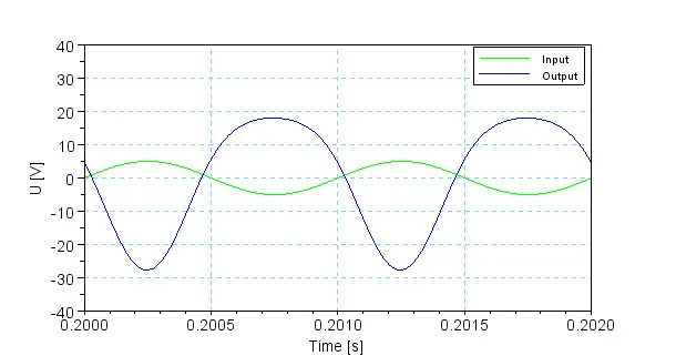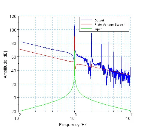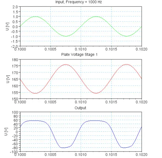 The input signal (green) has an amplitude of 1 V. The first stage amplifies the signal almost linear (red). Since the input amplitude of the second stage is already very high, this stage is no longer able to amplify the signal linear. As a consequence, there are strong distortions in the output signal caused by tube cut-off and grid current (blue).
