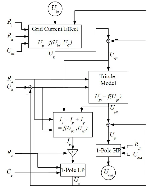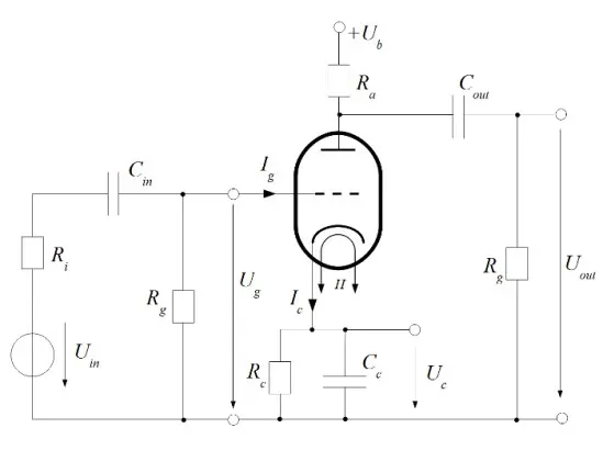 In this circuit, cathode biasing is used to adjust the bias point of the tube. This is realised by a resistor (Rc) and a capacitor (Cc), placed between the cathode and ground. The effect of cathode biasing can then be modeled by a simple first order RC low pass filter, with Ic*Rc being the input of the filter, and the cathode voltage (Uc) being the output.