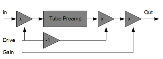 To get a constant amplification factor in the digital domain, the plugin has a drive and a gain knob: