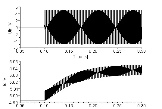 If the input signal jumps for example from 0 V to 5 V, the cathode voltage follows quite similar to the step response of a RC-low pass filter: