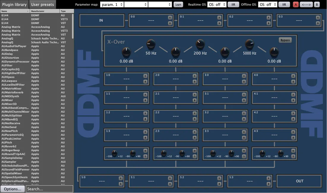 - 4 plugins in serial before a 4x4 multiband block, which is summed and fed into another 4 plugins in serial